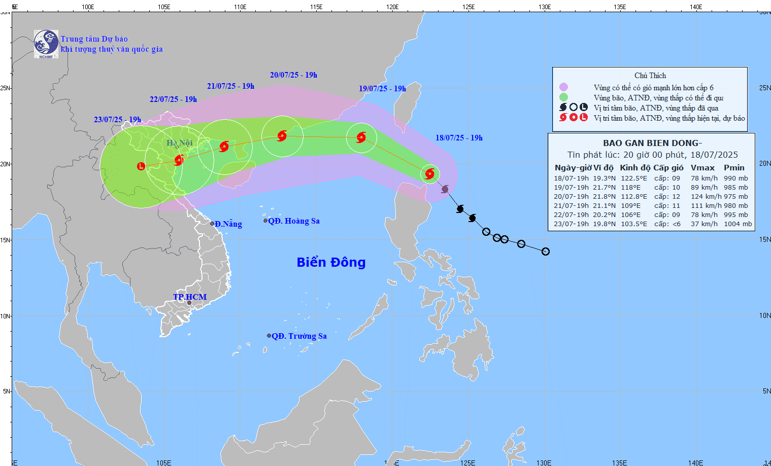 Vị trí và đường đi của bão số 3 vào tối 18/7 (.Ảnh: nchmf).