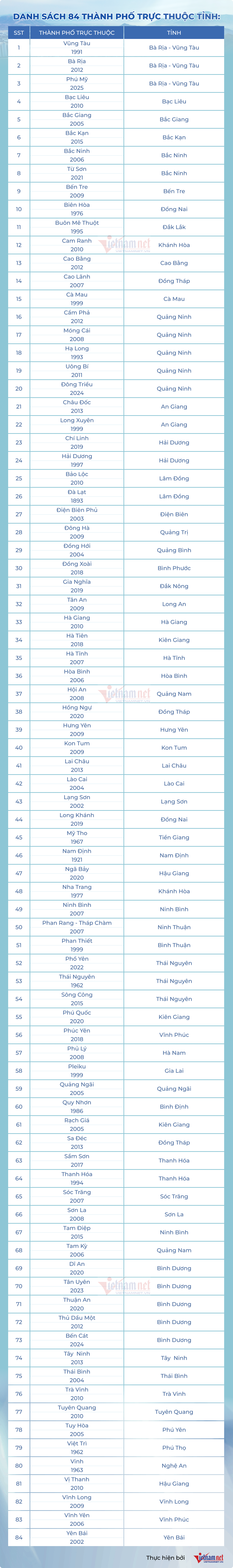 Trong số 84 thành phố trực thuộc tỉnh có một số mới thành lập như Phú Mỹ (2025), Hoa Lư (2025), Đông Triều (2024), Bến Cát (2024)… Thành phố Thủy Nguyên (trực thuộc thành phố cấp trung ương Hải Phòng) cũng mới được thành lập ngày 1/1.