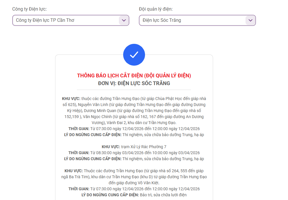Theo https://www.cskh.evnspc.vn/TraCuu/LichNgungGiamCungCapDien