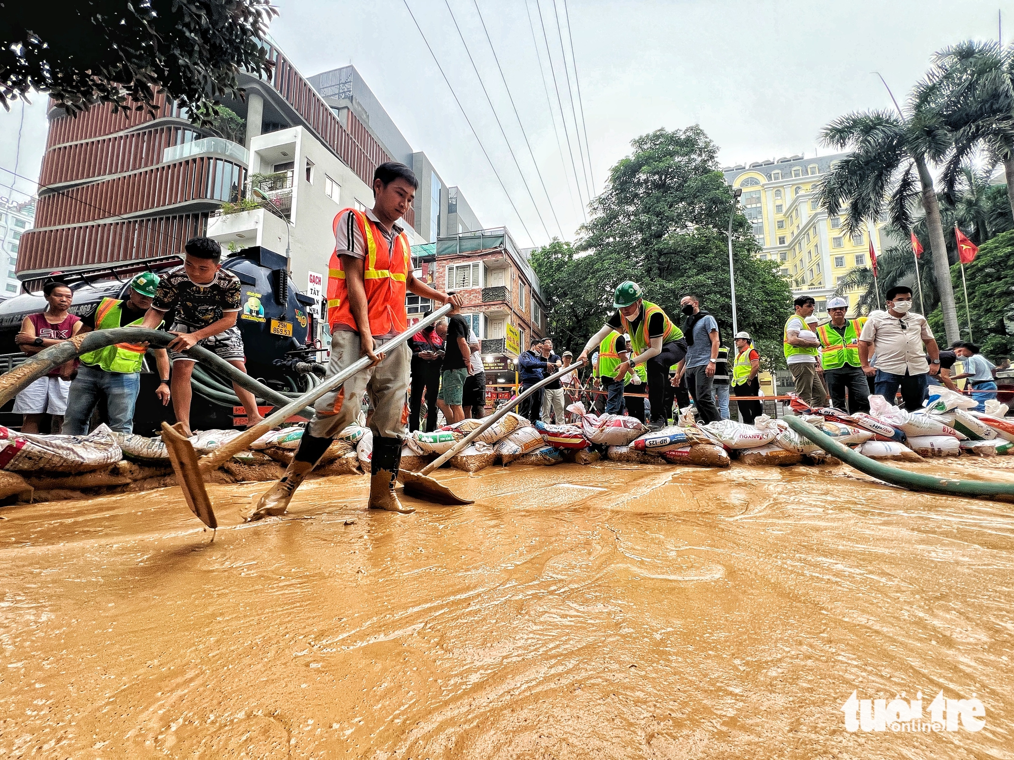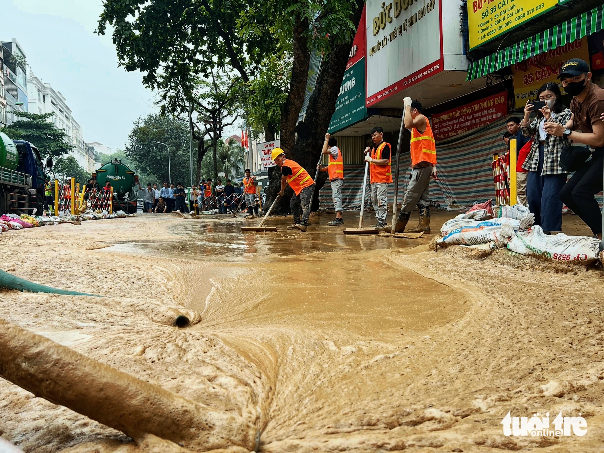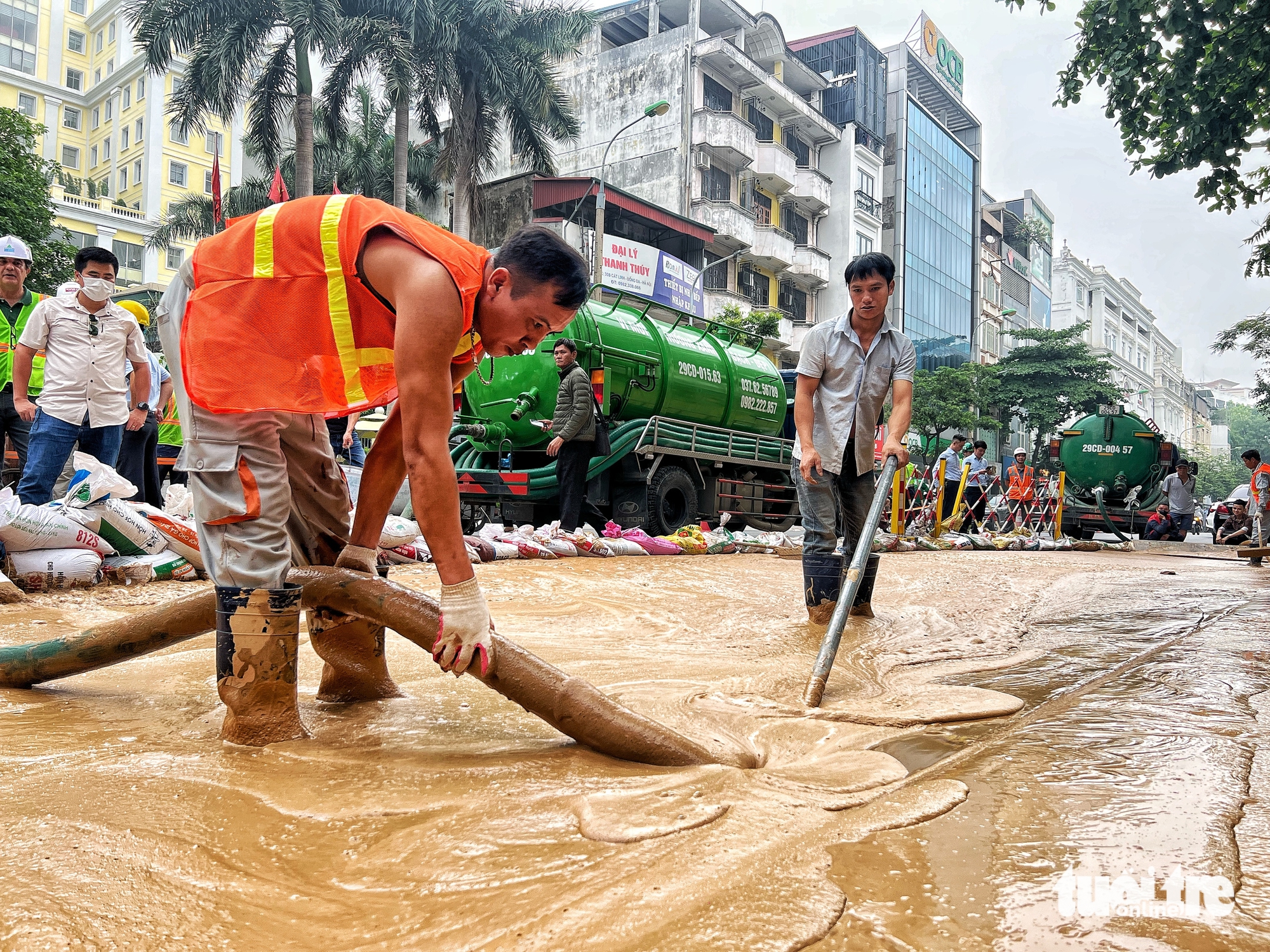 Nhà thầu đã thực hiện các biện pháp khắc phục, huy động tối đa nhân lực, các xe hút bùn, thu gom và xử lý bùn tại hiện trường – Ảnh: PHẠM TUẤN