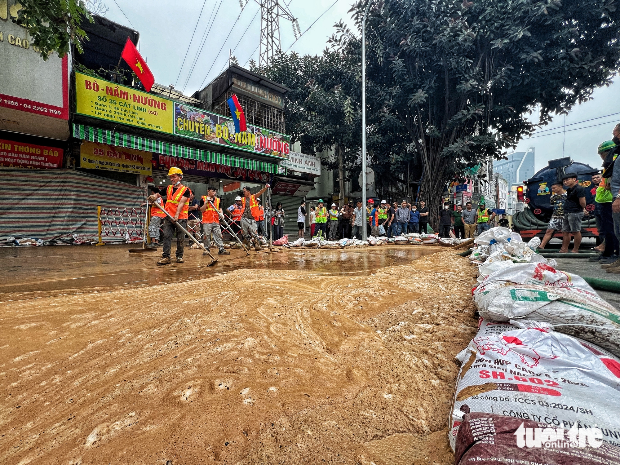 “Chiều nay có hiện tượng trào bùn đất lên trước cửa nhà tôi. Bùn đất trào lên, lúc chưa chèn các bao cát cao gần 1 mét. Sau đó đơn vị thi công đã mang bao cát để ngăn bùn trào ra đường, nhưng bùn vẫn tiếp tục trào lên” – bà Lam kể.