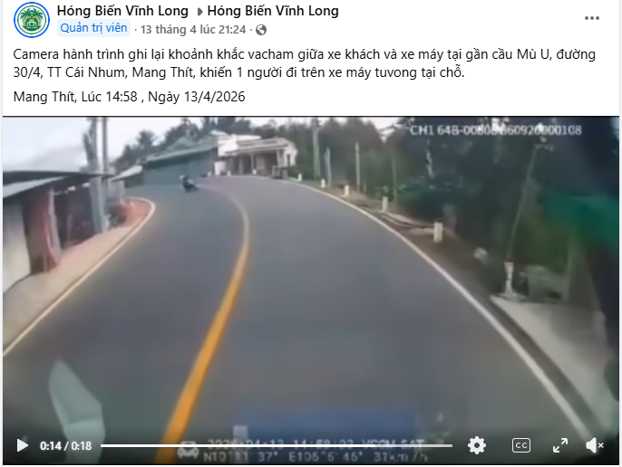 Vacham giữa xe khách và xe máy tại gần cầu Mù U, đường 30/4, TT Cái Nhum, Mang Thít, khiến 1 người đi trên xe máy tuvong tại chỗ.