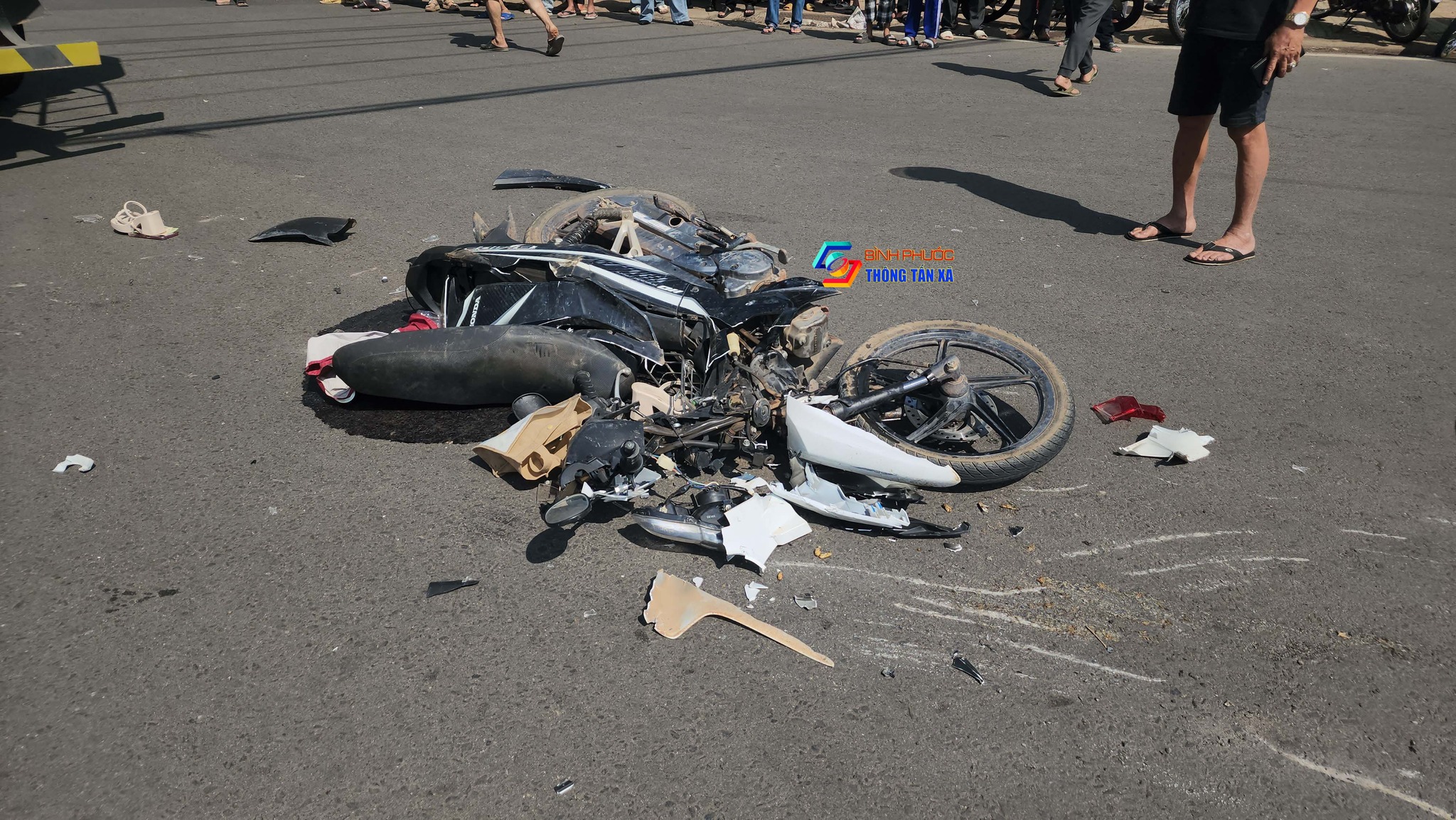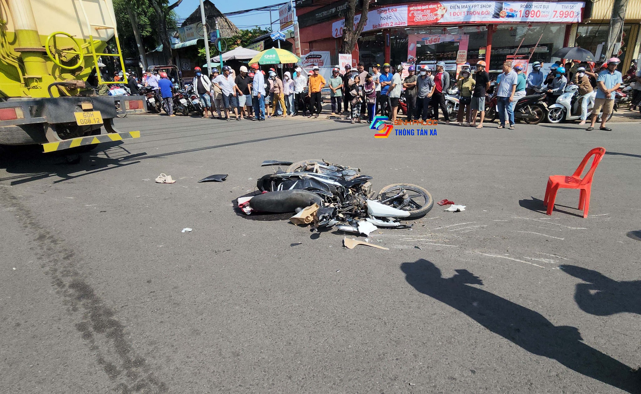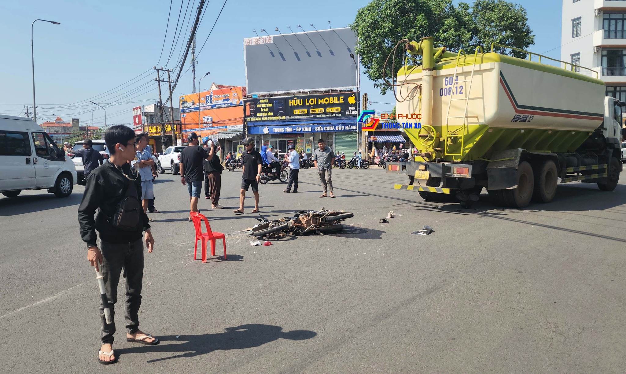 Tại hiện trường, xe máy bị hư hỏng nặng nằm giữa đường, xe bồn chạy về phía trước khoảng 5 m thì dừng lại.
